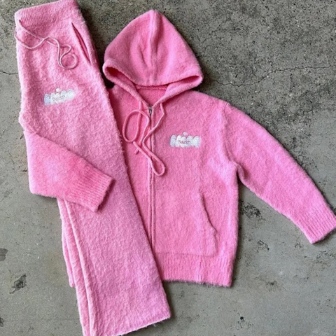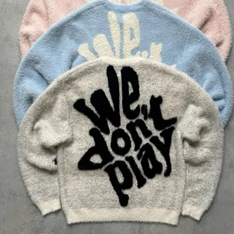 Suéter de punto borroso con logotipo personalizado, suéter de moda con letras de Mohair Jacquard Mohair, ropa de calle para hombre, conjunto de Sudadera con capucha de punto para hombre